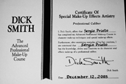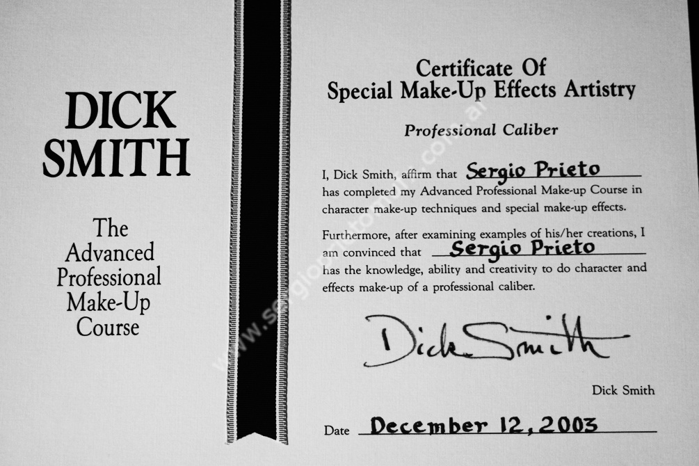 Sergio Prieto es egresado del curso Advanced Professional Make-Up Course And Special Make-Up Effects Techniques dictado por Dick Smith, conocido por producciones como El Exorcista, El Padrino, Estados Alterados, El Ansia, Amadeus (Oscar de La Academia), entre otros. Egresó del mismo con el certificado de Professional Level, siendo éste el único otorgado por Dick Smith en persona, en toda Sudamérica. Debe destacarse que no se trata de un simple certificado de fin de curso, sino de uno que sólo se le otorga a aquél que haya alcanzado el exigente nivel académico exigido por Smith. No se egresa de este curso por el solo hecho de haber pagado su costo.